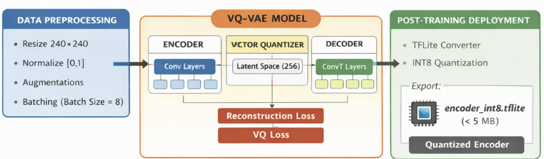 A lightweight autoencoder-based architecture is used for video compression. The encoder compresses input frames into a compact latent representation. The model is trained offline using standard deep learning frameworks. Post-training, the model is quantized (e.g., INT8) using TensorFlow Lite to reduce memory and computation requirements