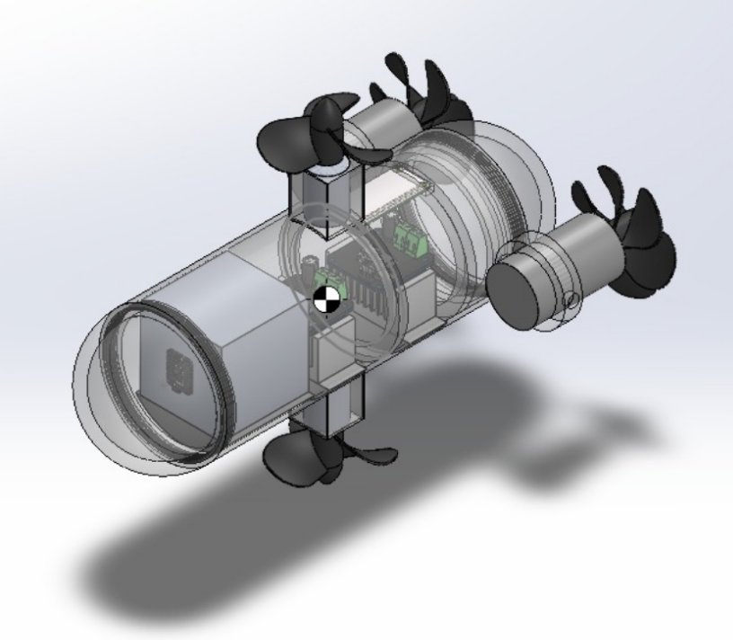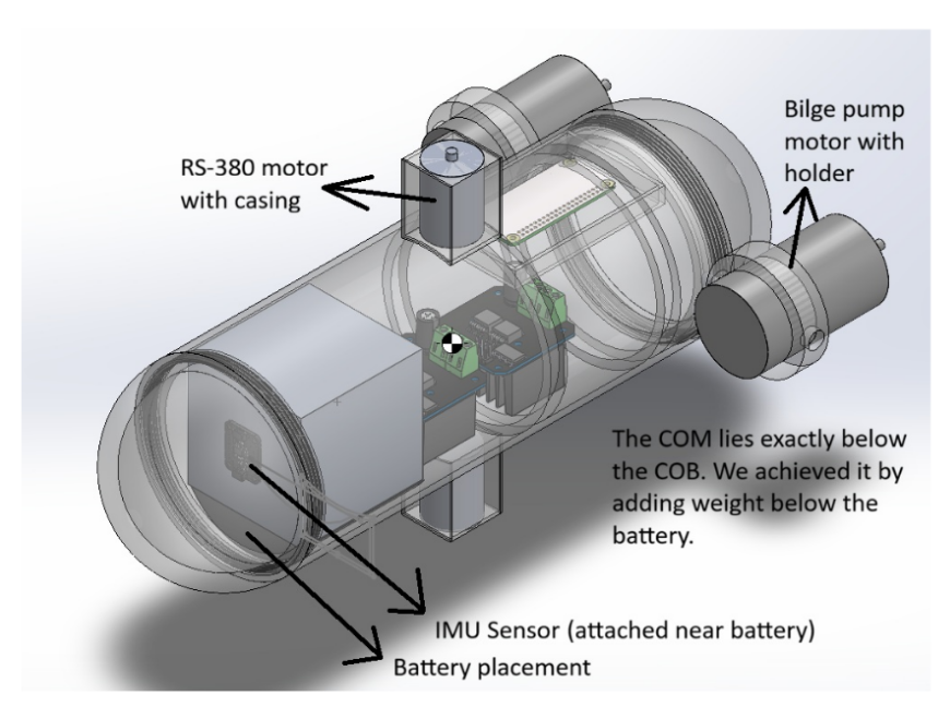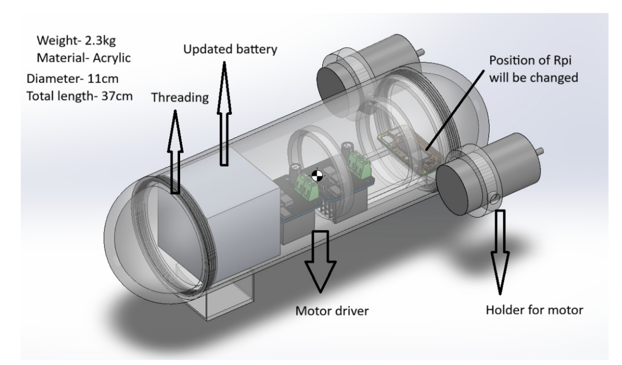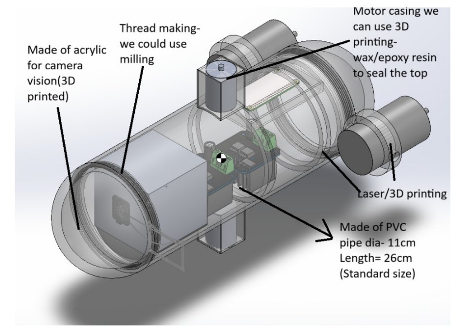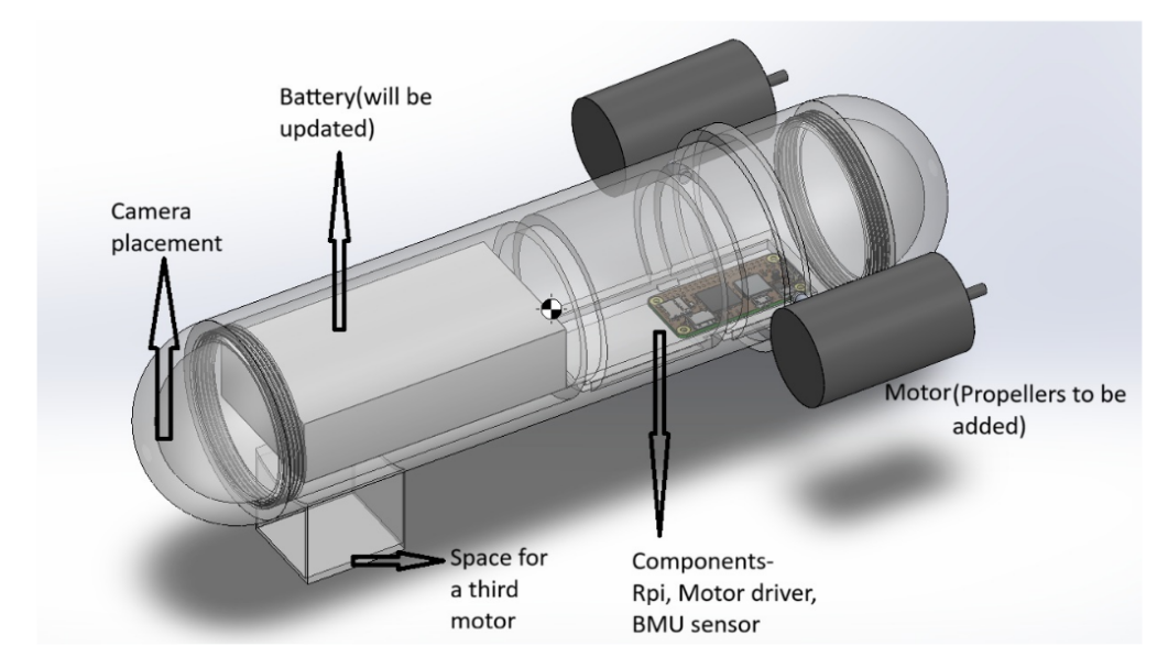 We have chosen a cylindrical body with spherical ends because it is aerodynamically efficient (reduces drag) and is generally used in submarines. To make it waterproof at the ends and for easy assembly and disassembly, we have provided threading on both sides. We have placed the motors at the end (for surge) as the battery is in the front, and the weight will be balanced. First, we planned to keep only one motor at the bottom (which we later changed) for the heave motion.